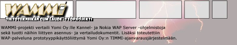MateriaaliresurssitProjektiryhmä työskenteli Yomi Oy:n tiloissa, jotka aluksi sijaitsivat Kauppakatu 19D:ssä ja aivan projektin loppuvaiheessa Jyväskeskuksessa. Jyväskylän yliopiston tietotekniikan laitos toimitti ryhmälle kaksi 500MHz:in prosessorilla varustettua tietokonetta. Käyttöjärjestelminä näissä olivat sekä Linux Redhat 6.1 että Windows NT 4.0. Ohjelmistoista tietokoneisiin oli asennettuna mm. Microsoft Office 2000, JBuilder 3 Professional, Netscape Communicator 4.7 sekä F-Secure SSH. Myös toimeksiantaja järjesti projektiryhmän käyttöön yhden tietokoneen tarvittavine ohjelmineen.DokumentaatioProjektin dokumentaatio löytyy kokonaisuudessaan tietotekniikan laitokselta projektikansiohyllystä.Projektiin liittyvissä asioissa voi ottaa yhteyttä Tamu Keroon (kero@yomi.fi). |
